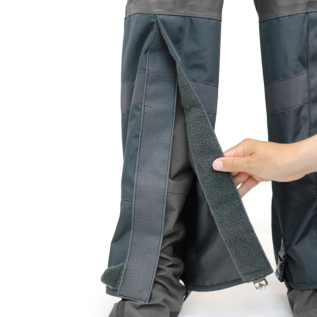 ベルクロ留めのフラップにより、すっきりとした 収まりと素早い脱着を実現。 大型のYKKファスナーを採用し、塩噛みや トラブルに強い設計です。さらにフラップ構造 によって、防水性をウェーダー上部まで しっかりと確保しています。