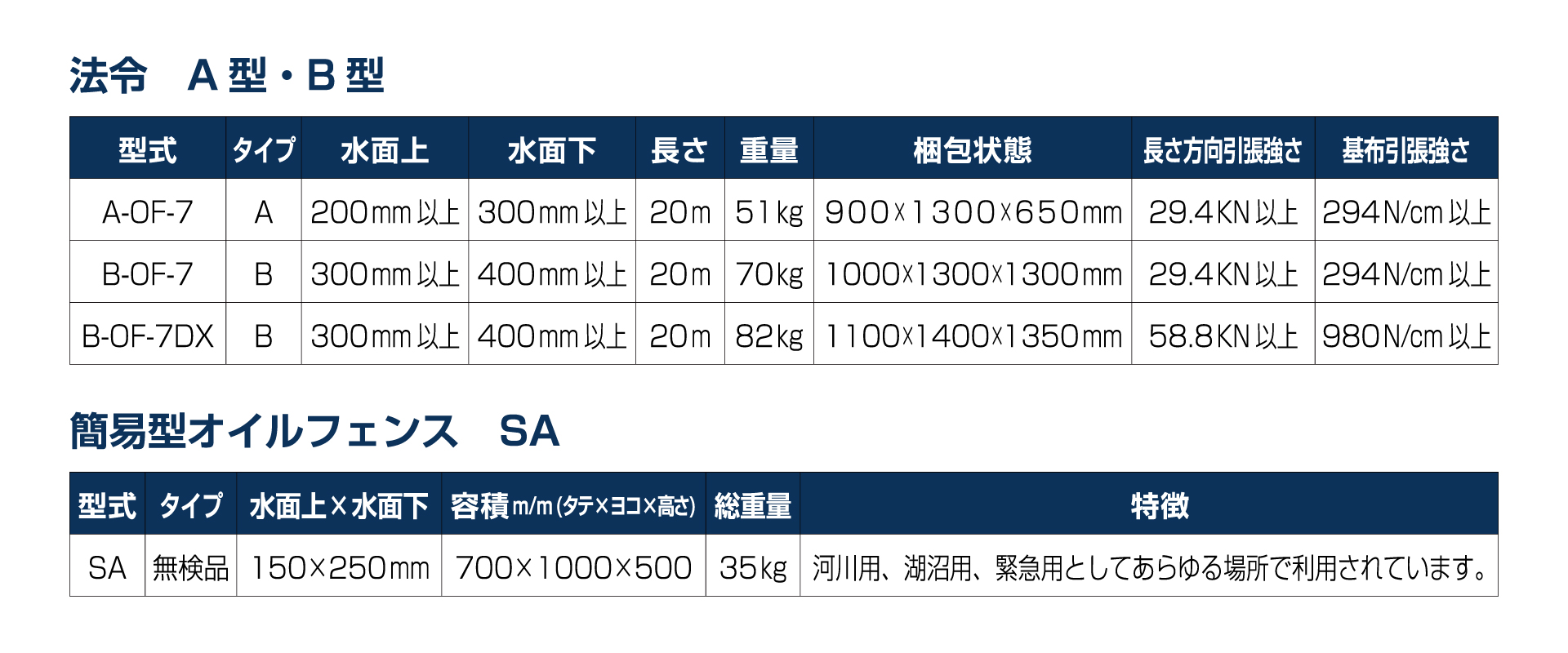 オイルフェンスは、国土交通省から型式承認を受けた法令A型・B型の他、簡易型オイルフェンスSA、吸水拡張型Tフェンスなどを取り扱っております。型式承認品の場合、他社のオイルフェンスとの接続が可能です。法令品以外でも、現場環境に応じたオイルフェンスをオーダーメイドで製造しています。